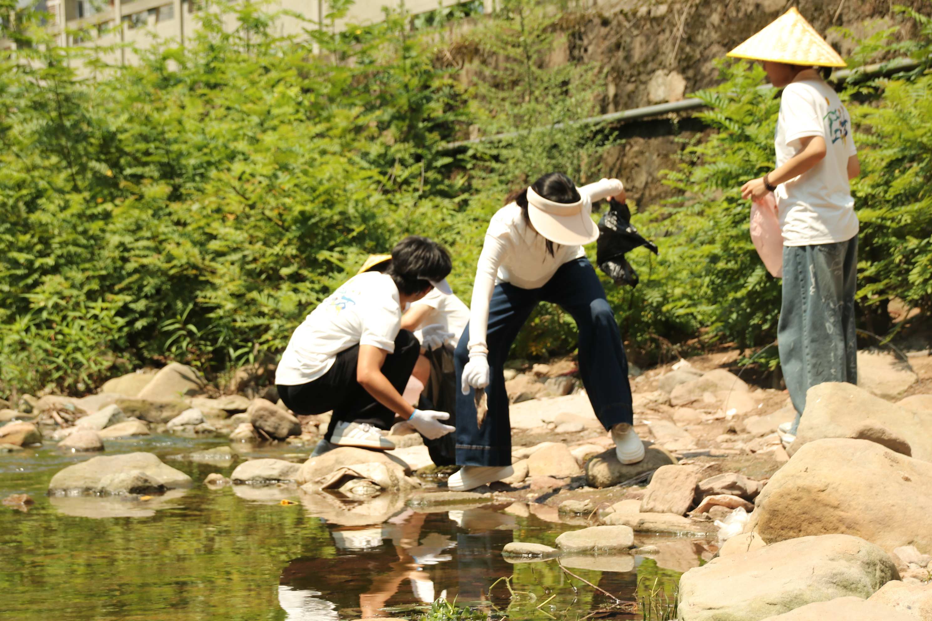 清晨,伴随着初升的朝阳和清脆的鸟鸣,“四叶草”团队的成员们在带队老师的带领下,前往沿河边集结。前行途中,就已经闻到了河道传来的隐隐约约的臭味,“我倒要看看有多脏!”其中一位成员不但没有退缩,反而眼神愈加坚定。他们穿戴手套、手拿垃圾袋,化身“河小青”,沿着蜿蜒的河道开始了细致的清理工作。河滩草丛中隐匿的塑料瓶、食品包装袋,水流冲刷堆积的泡沫板、枯枝杂物,甚至是深陷泥泞的废弃渔网……都成为了他们“战斗”的目标。他们或弯腰拾捡,或协作清理,或艰难跋涉于湿滑的滩涂,将一片片垃圾装入袋中。每一次俯身,都是对“绿水青山就是金山银山”理念的生动践行;每一次清理,都饱含着对“母亲河”的深情守护。经过数小时的辛勤劳动,贯穿红狮镇的河岸线焕然一新。清澈的河水映照着队员们忙碌的身影和洁净的河岸,绘就了一幅动人的青春画卷。