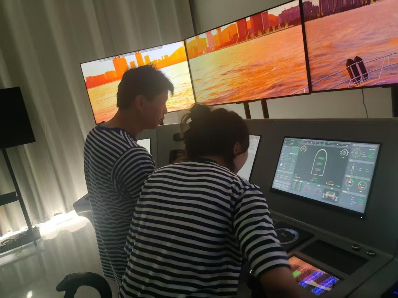 图为海智安检团队在和丰互动科技体验船舶模拟器。王璇 拍摄