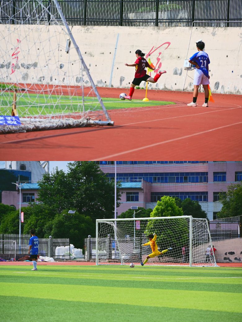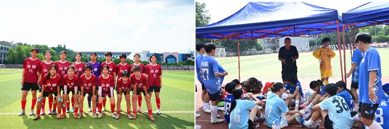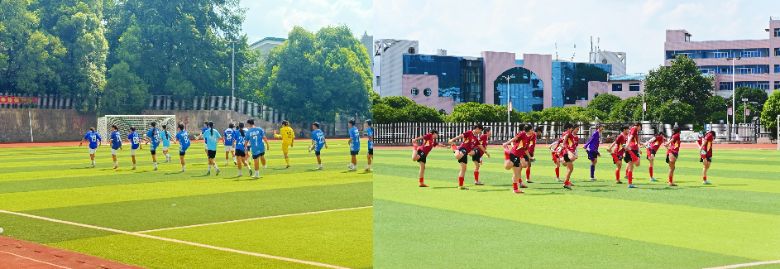 午后阳光洒满武冈二中的操场,湖南省女足友谊赛在此进行。绿茵场上,队员们完成传球、带球、射门等动作,球鞋接触草皮的声音与场边的助威声交织,红蓝两色球衣随奔跑移动。