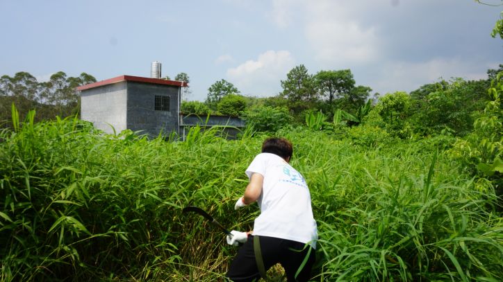 这是我第一次握起镰刀除草,起初总拿捏不好力度,在身边工作人员耐心示范下,我渐渐摸到了窍门,与队友和其他志愿工作者们一同沉浸在这块土地里。一片片杂草应声倒地,我深知,今天的努力不仅仅是为了这些树苗的健康成长,更是为了那片我们共同的绿色梦想。