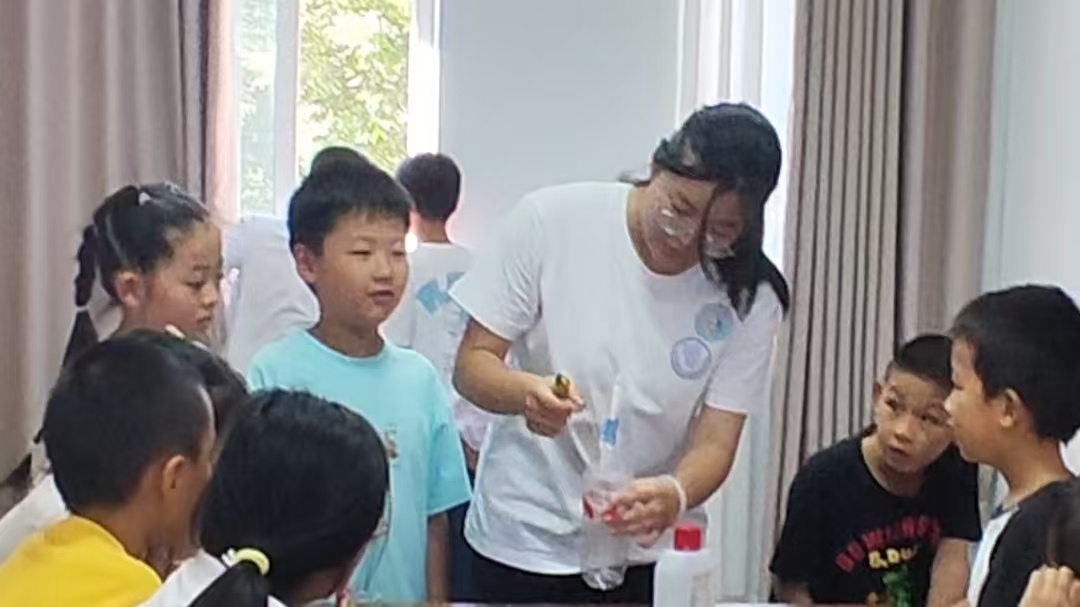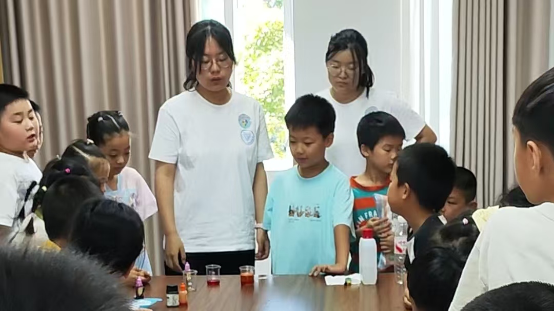 之后,实践团来到了暑期驿站,为孩子们带来了一场精彩的化学表演和生动的化学知识科普。本次实验结合了可行性与观赏性,因地制宜,并对实验流程进行了多次演练,确保实验的安全性和效果。