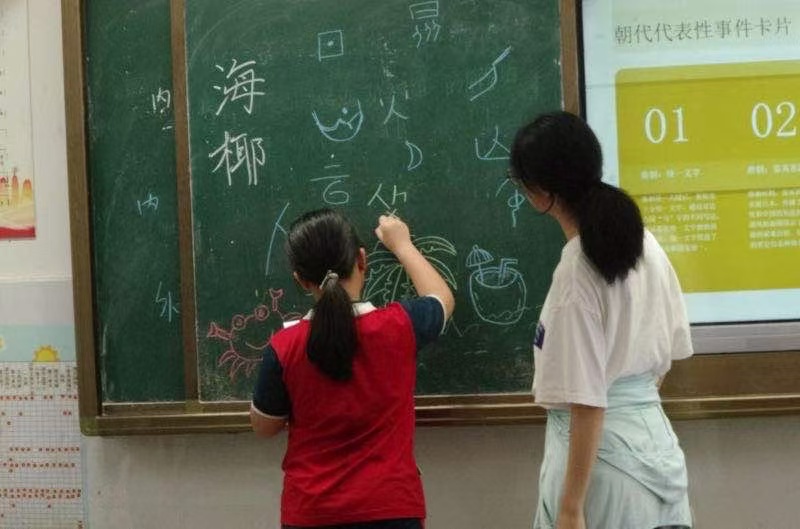 "海南像大菠萝,广东是烤鸡腿!"在地理课堂上,志愿者刘秦伯用PPT中的"省区轮廓比喻"点燃孩子们的热情。通过"云南—孔雀""台湾—芭蕉叶"等形象比喻,学生们迅速记住各省形状。互动环节"我指你答"中,孩子们争相抢答:"甘肃是数字7!""新疆是牛头!"等等。