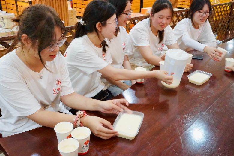 随后,团队成员来到豆腐主题文化园。在工作人员的讲解下,一场关于豆腐文化的千年画卷就此展开。从刘安炼丹误发明豆腐的古老传说,到豆腐制作技艺在历史长河中的演进,成员们穿梭于千年时光,窥见豆腐文化不断发扬的蜕变。这一过程中,他们不仅聆听了引人入胜的故事,还目睹了传统工艺的精妙,更体悟到豆腐在中国文化版图中的重要性。而当他们走进互动体验区,亲手磨豆浆、点豆腐,看着白嫩的豆腐渐渐成型,内心对豆腐文化的热爱也在这一瞬间被点燃。