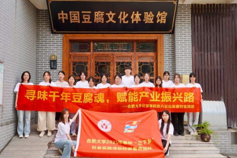 为深入探究淮南市八公山乡村豆腐产业的发展现状,剖析传统工艺与现代科技的融合路径,引导社会聚焦豆腐产业可持续发展这一关键议题,为乡村振兴注入新动力,合肥大学经济与管理学院“合启淮章”团队于2025年6月29日前往奔赴淮南市寿县八公山乡,开展了一场意义非凡的学习调研之旅。团队成员们先后走进中国豆腐村、豆腐主题文化园、淮南王刘安墓以及珍珠泉等地,全方位、沉浸式地探寻豆腐文化的根源与魅力。