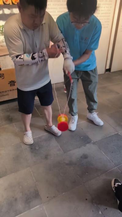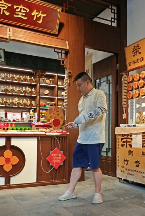 在古宅青砖黛瓦的映衬下,孙光辉老师手中的空竹仿佛被赋予了灵动的生命。“照镜子”,“鲤鱼跳门”,“下面条”等动作一气呵成,孙光辉老师游刃有余。每一次的拋接,都吸引了我们的目光。