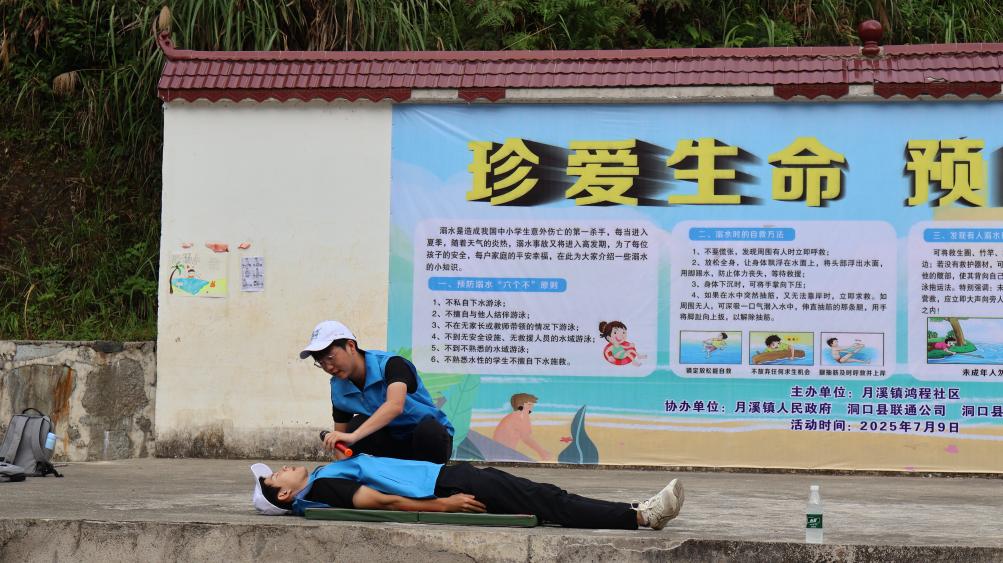 (通讯员 尹妤伊 邵一乐 徐嘉俐)2025年7月9日,湖南师范大学体育学院“领梦者·弘帆”实践团在月溪镇鸿程社区易地扶贫安置点广场,开展了一场与国家级课题《CEPF青少年应急避险体适能智慧课程》紧密结合的生命安全教育活动。出席本次活动的嘉宾有驻村第一书记潘文军、月溪镇鸿程社区支部书记刘永定、洞口县发展和改革局驻村队员胡鹏飞、洞口县发展和改革局驻村队员邓伟兵、月溪镇中心小学校长王国槐以及湖南师范大学体育学院“领梦者·弘帆”实践团指导老师伍艾。活动聚焦防溺水、防性侵、消防避险等核心安全问题,旨在增强当地儿童安全意识与应对突发情况的能力,为乡村儿童成长保驾护航。
