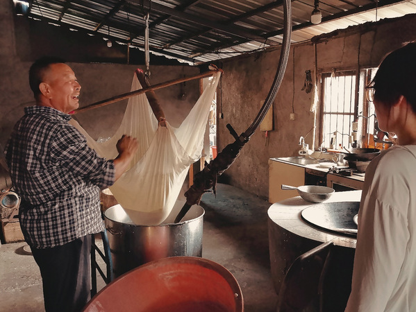 实践团的首站深入幽居村村民家中,近距离观摩、参与传统豆腐制作的全过程。从豆子浸泡、石磨磨浆到柴火煮浆、点卤成型,同学们被这份传承的匠心所吸引。热情好客的村民大妈邀请大家品尝新鲜出炉的纯天然豆浆,甘甜的滋味令人难忘。付瑞钰同学感慨道:“豆浆健康又美味,但日复一日早起做豆腐真的很辛苦。大妈的热情让我们倍感温暖,虽然我们坚持付了钱,但这份淳朴的乡情是无价的。”聂诗莹同学则敏锐地观察到了乡村产业的内生协作模式:“我们了解到村民之间形成了高效的接力合作。一户人家完成鲜豆腐制作后,会直接供应给下一户进行煎制,最终产品被带到镇上销售。这种邻里间的产业链条,是乡村智慧的生动体现。”