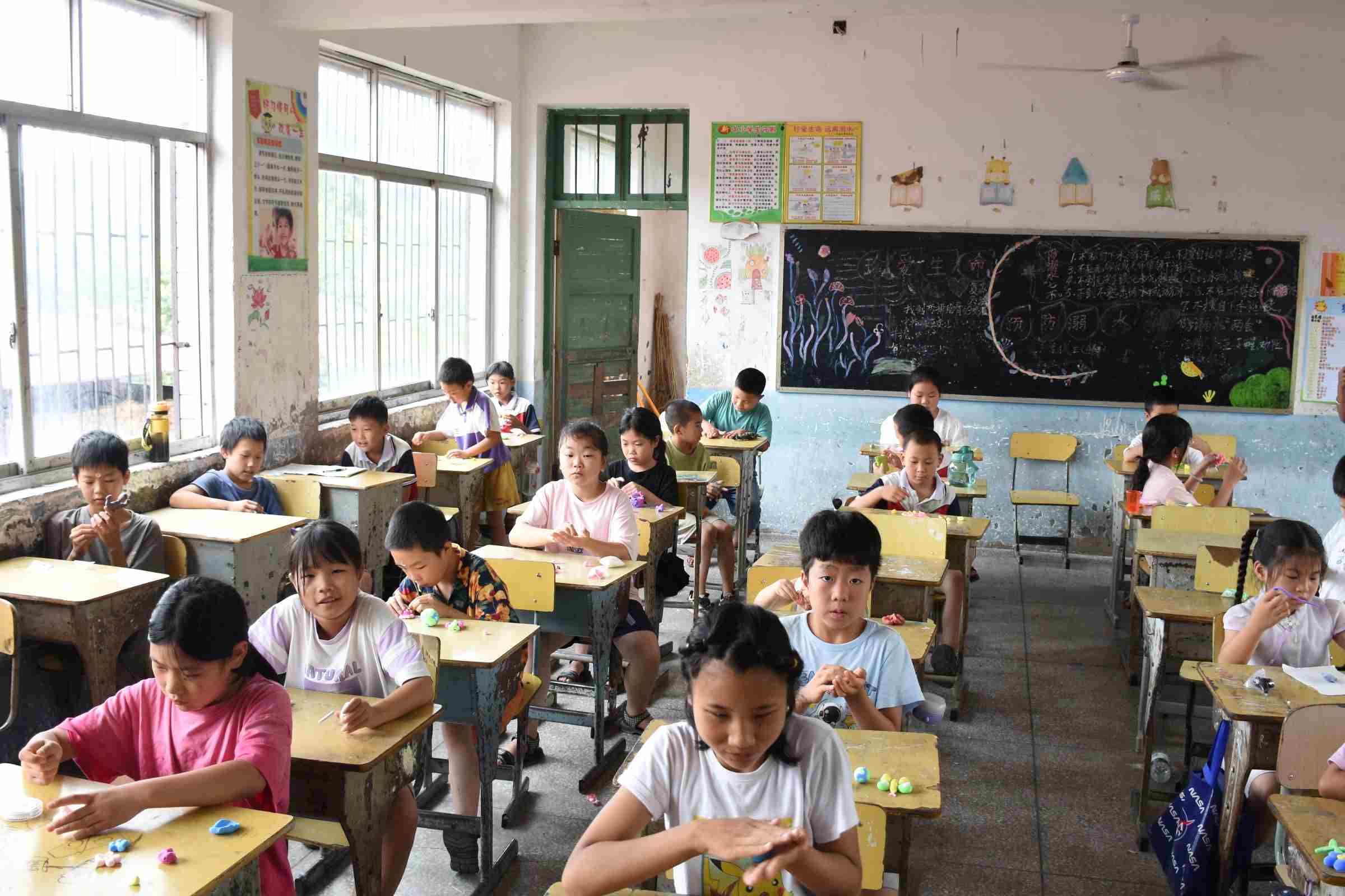 上午的手工粘土课上,实践团将村委提出的"乡土元素融入"要求转化为生动教学。课程进行中,实践团意外发现当天恰是8岁学生小林的生日,立即组织了一场特别的庆生活动。穿蓝色衣服的支教团们正和孩子们一起用粘土制作"生日快乐"立体字样,背景墙上"建设美丽乡村"的标语格外醒目。