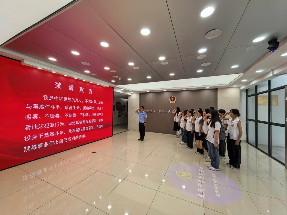 为进一步深化对禁毒责任的认识,实践团成员们在江苏省太湖强制隔离戒毒所四大队四级警长、“青锋禁毒课堂”金牌讲师团成员、全国司法行政戒毒系统个别教育能手孙犁的带领下进行学习参观,为表达致敬之情与感谢之意,同学们送上原创朗诵《在星光下,我们共同守护》,“他们是守护者,是夜行者,在黑暗中与罪恶对峙,守护着黎明的曙光……”最后,大家以最诚挚的心缅怀那些在禁毒斗争中牺牲的英雄,高擎右手,铿锵有力地喊出禁毒誓言。