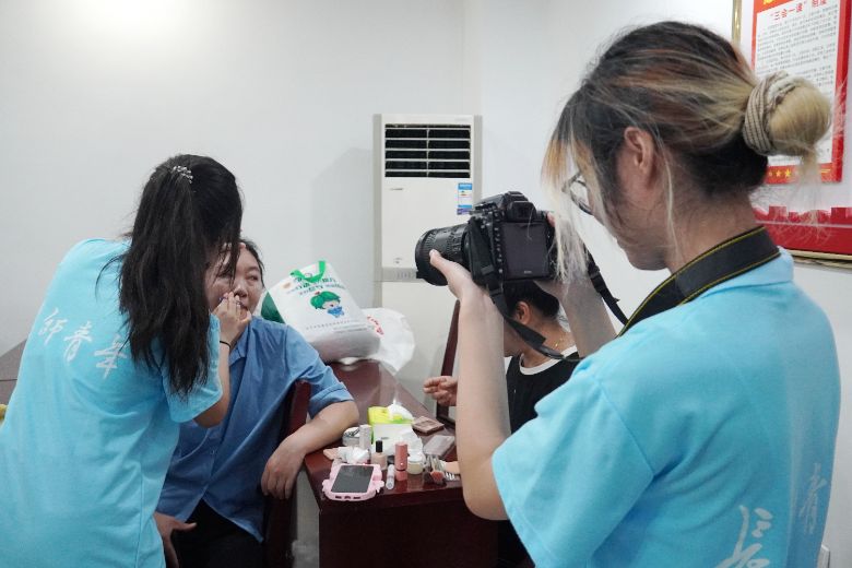 志愿者协助老人挑选自己心仪的服装,并根据服饰特点设计妆容及发型。在志愿者的声声夸赞中,老人们逐渐放松,尝试更多年轻人的拍照姿势。