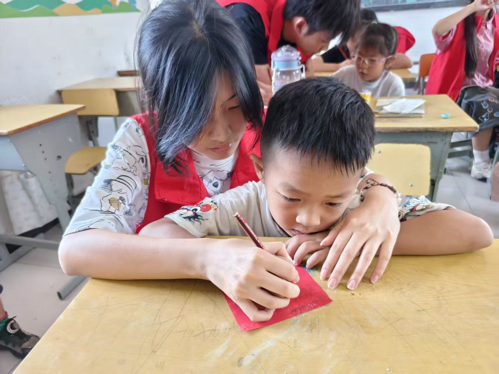 "亲爱的爸爸..."在"家书寄情"环节,孩子们将思念倾注笔端。志愿者……轻声指导着低年级的孩子组织语言,帮他们修正错别字。当看到留守儿童小强写给父母"我会照顾好爷爷奶奶"的承诺时,在场的志愿者无不为之动容。这些承载着思念的信件,将成为连接亲情的温暖纽带。