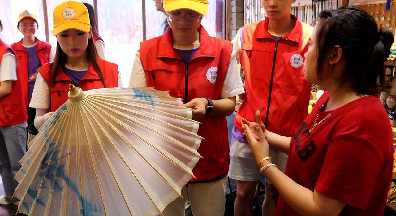 促进团前往松溉古镇,走访油纸伞技艺传承人,深入了解油纸伞古法技艺。传承人热情地接待了团队成员,详细介绍了油纸伞的历史渊源、制作流程和艺术特色。在传承人的工作室里,团队成员们近距离欣赏了一把把精美的油纸伞,被其绚丽的色彩和细腻的工艺所震撼。非遗传承人张师傅手持竹骨,向成员们娓娓道来:“一把油纸伞,要历经选竹、削骨、裱纸等七十二道工序,竹骨得选三到五年生的楠竹,韧性足、不易折。”说着,他将竹条浸入沸水煮制,“这是为了防虫防霉,老祖宗的法子,一步都省不得。”此次走访让成员们深刻体会到每一把油纸伞都是历史与匠心交织的活态传承。