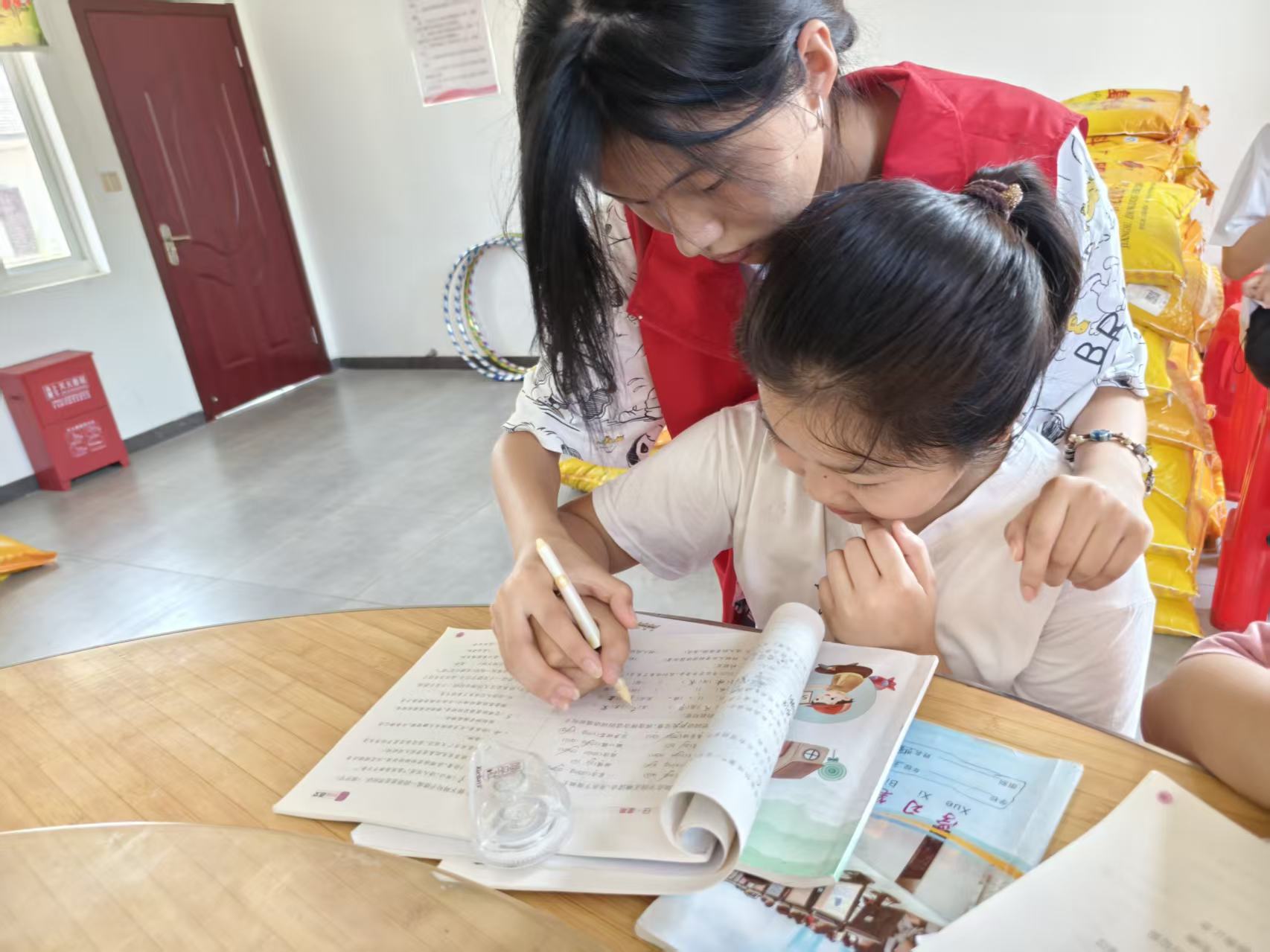 图为巢湖学院志愿者在烔炀镇中李村教室辅导作业。(全宇 供图)