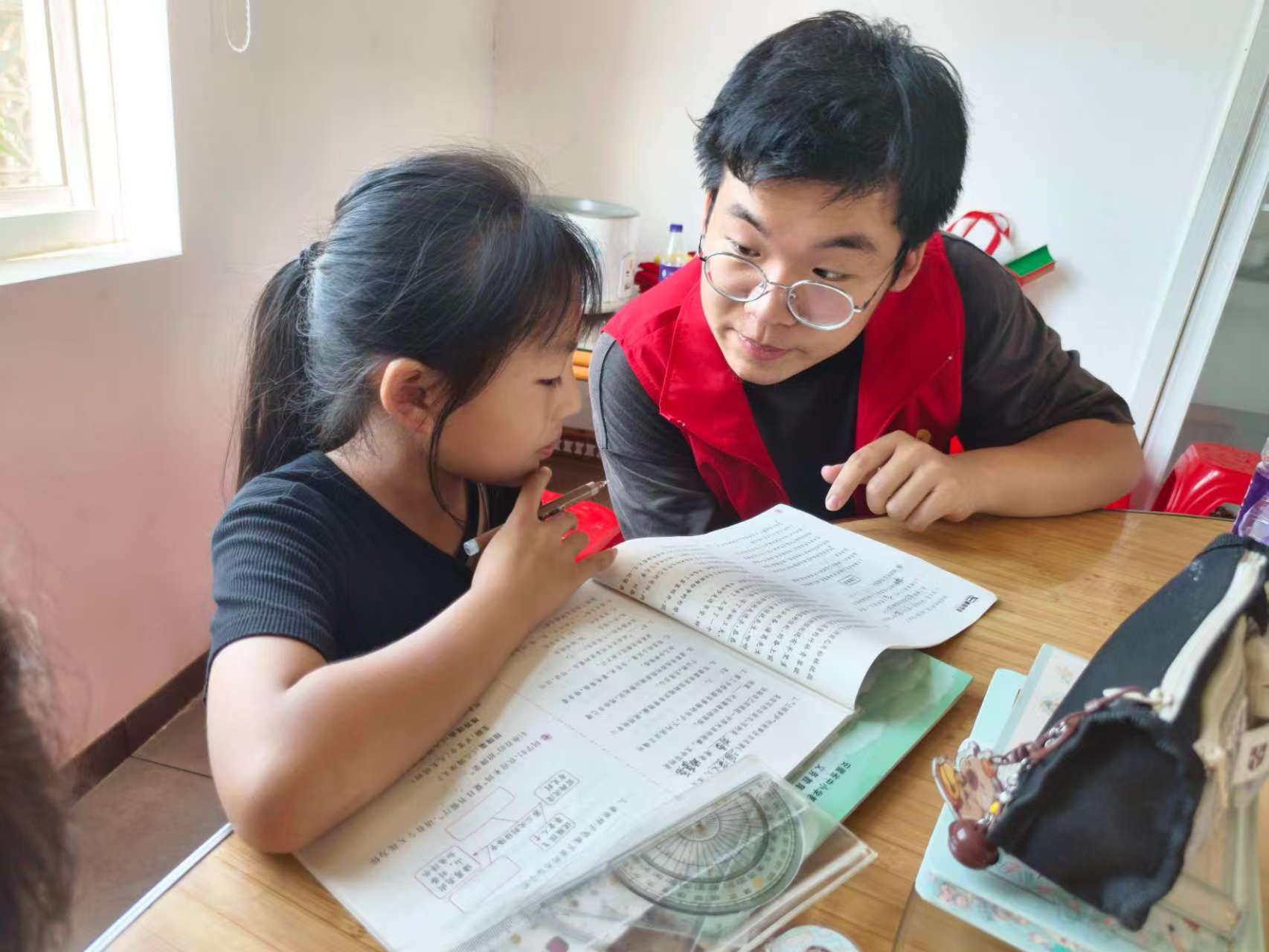 实践团在进行丰富的课程学习后,开展了课业辅导行动。志愿者们耐心陪伴孩子,针对语文阅读难点,逐句解析文意、引导思考感悟;数学则从生活实例切入,化解公式理解困境。专注辅导的身影、细致答疑的话语,帮孩子攻克学习难题,也传递知识温度,用实际行动为乡村学子暑期成长助力。课业辅导不仅是知识的传递,更在城乡之间架起了一座温暖的桥梁。它让乡村孩子感受到来自外界的关注与支持,点燃了他们探索世界的求知欲,也让志愿者在实践中深化了对教育意义的理解,以青春之力践行着助力乡村教育振兴的责任与担当。