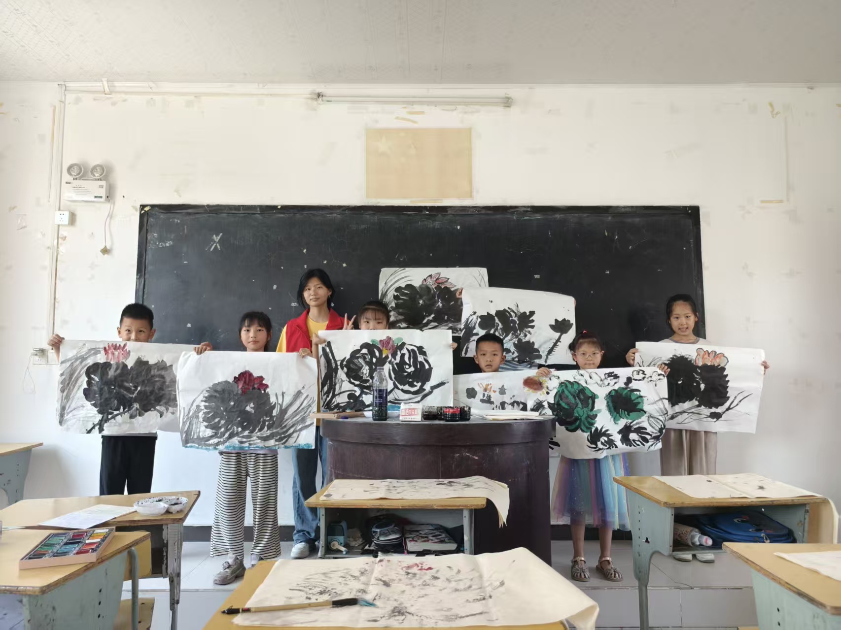 图为巢湖学院志愿者在烔炀镇中李村教室带孩子上数学课与绘画。(全宇 供图)