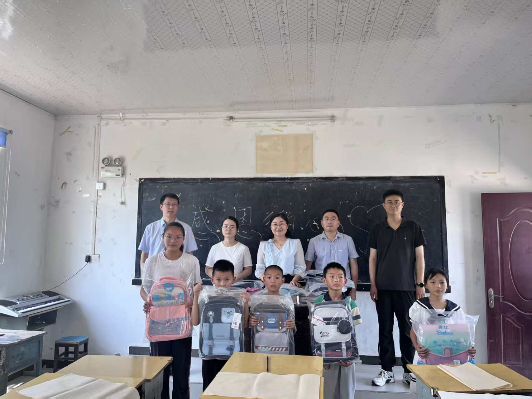 图为巢湖学院机械工程学院领导及中李村干部为孩子发放书包。(全宇 供图)