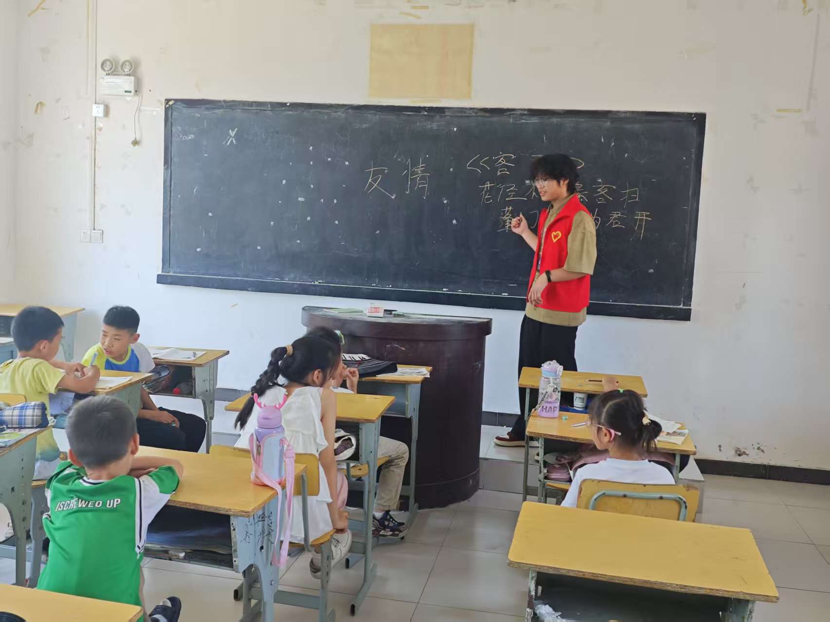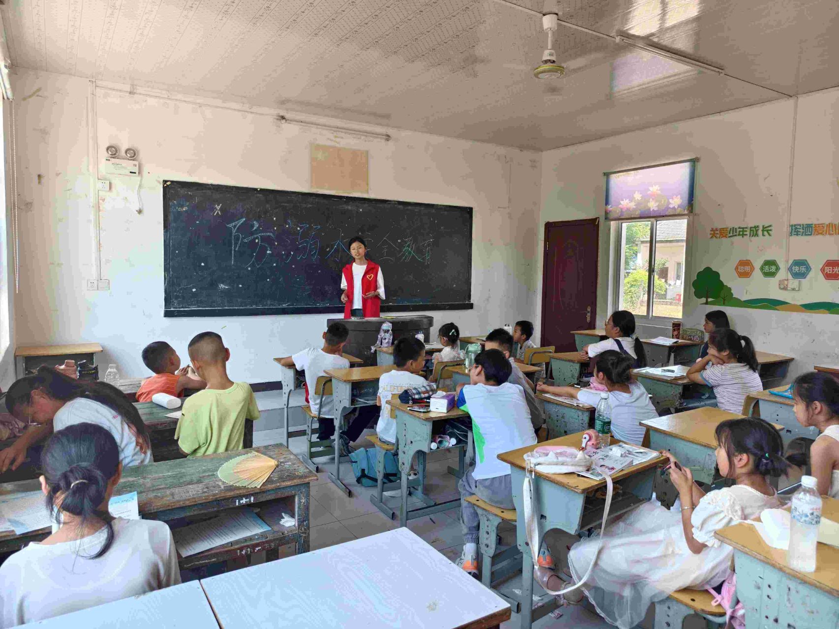 除了丰富多彩的文化艺术课程,志愿者们还为孩子们带来了实用的安全教育与学业辅导。上午,志愿者汤媛媛为孩子们带来了一场生动实用的“暑期防溺水安全教育课”。通过知识讲解、互动问答等形式,向孩子们普及了水域安全常识、自救互救技能,筑牢暑期安全防线,守护孩子们的生命健康。与此同时,针对留守儿童普遍存在的学业辅导资源匮乏问题,团队开设了“学业加油站”,志愿者时永乐聚焦数学、英语等薄弱学科进行耐心细致的辅导,帮助孩子们查漏补缺,提升学习信心。