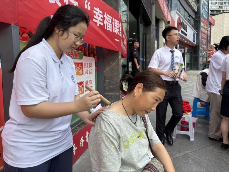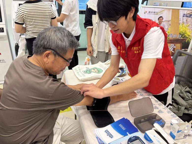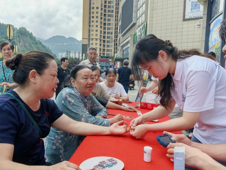 7月11日清晨,两江广场上的“爱心义诊”摊位前早早排起长队。实践团迅速开展测血压、查血糖、艾灸理疗等便民服务。在义诊过程中,实践团成员细心记录每位居民的检测数据,对血压偏高的5位老人进行健康生活方式指导,并留下社区卫生服务中心的随访电话。