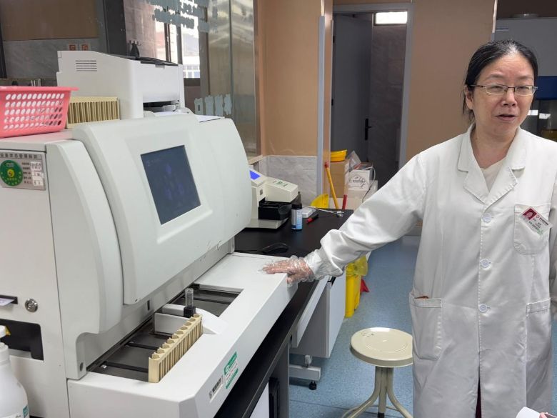 图为郭萍老师向实践团成员介绍血液分析仪(陈心月摄)