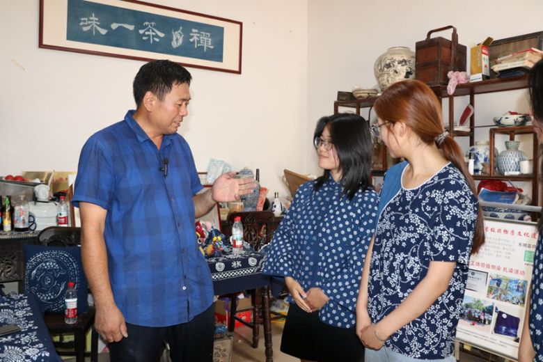 实践队队员走进刘楼镇蓝印花布制作基地,在传承人陈先生的工作室里,靛蓝色布料在阳光下泛着光泽。“这门技艺已有1300多年历史,靠镂空版白浆防染,全凭手工传承。”陈先生拿起一块老粗布,讲述着收购布料的艰辛:“现在没人织粗布了,只能挨家挨户收,每匹布都承载着岁月的温度。”