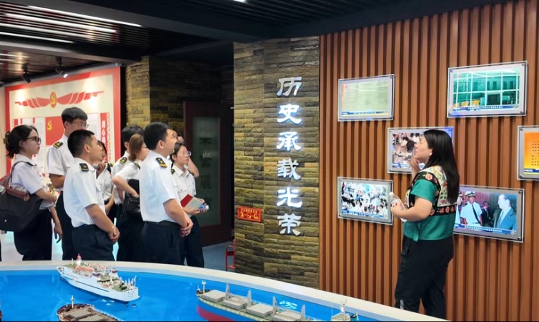 在船员发展荣誉展室,实践队成员沿着历史脉络,回顾了天津分公司,从成立初期船员们拼搏奋斗的岁月,到如今运用现代化管理系统的跨越发展。每一个阶段的展品与介绍,都生动展现了公司“追求卓越、永不止步”的企业精神,以及敢为人先的开拓精神。