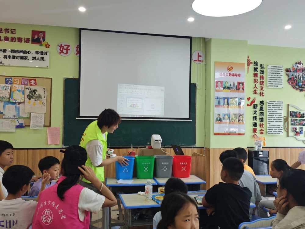 作业辅导结束后,以“垃圾分类,从我做起”为主题的文明生活教育活动正式启动。团队成员通过概念讲解、图片展示与视频教学等形式,引导学生系统了解垃圾分类知识,使其掌握正确分类方法并树立自主的文明意识。为提升学生参与积极性,团队设置了游戏环节,并以小礼物作为激励,现场气氛迅速活跃起来——学生们踊跃举手抢答,甚至有小朋友兴奋地站在凳子上高举手臂示意,积极展示所学文明知识。通过互动实践,学生们不仅深化了对环保文明的理解,更切实提升了日常生活垃圾分类能力。