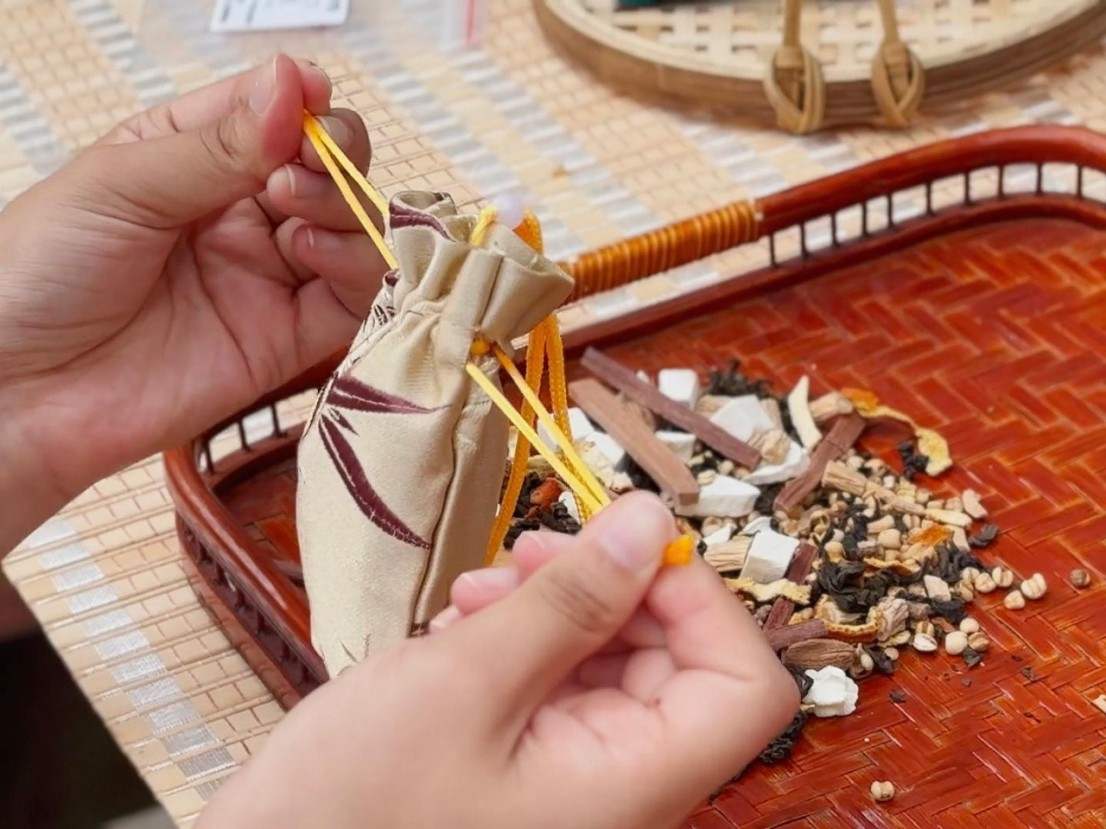 眉山乡不仅有深厚的铁观音茶文化底蕴,还有中药材种植传统,然而二者此前尚未实现产业联动。实践队敏锐地捕捉到这一机遇,以“四季养生”为理念,将铁观音茶叶与四季中药材巧妙融合,制作出“春生、夏长、秋收、冬藏”主题香囊。
