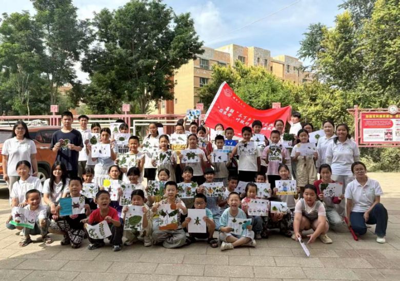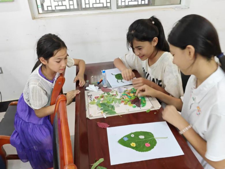 讲解结束后,活动进入“植物拼贴画”实践环节。在闫雪儿的现场指导下,孩子们利用预先准备的叶片进行裁剪、粘贴,并借助蜡笔完成美化装饰,创作出一幅幅充满童趣与创意的艺术作品。活动尾声,实践团对孩子们的作品逐一进行点评,给予肯定与鼓励,既激发了他们对植物的兴趣,也有效提升了动手创作能力。
