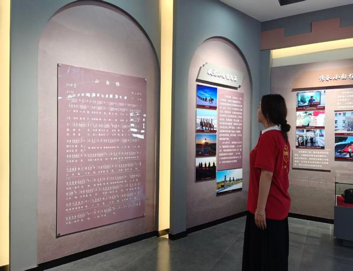 步入“白杨风采”展区,成员们的目光被墙上《小白杨》的词曲吸引,纷纷在歌词前驻足。凝视着那些承载深情的音符与文字,仿佛能看见当年树苗在戈壁风沙里挣扎扎根的模样。展厅里,锈迹斑斑的枪支、满是补丁的军装静静陈列,与歌词里“小白杨、小白杨,同我一起守边防”的字句交织,让大家真切触摸到戍边人在艰苦中坚守的温度——原来“坚守”不只是一句誓言,是风沙打磨不掉的信仰,是岁月侵蚀不去的担当,小白杨扎根边疆的倔强,早已融进战士们的身体里,化作守护家国的永恒力量。