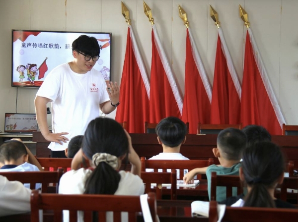 作业辅导结束后,“童声传红歌韵,薪火递爱国情”主题活动精彩上演。实践团成员带领孩子们学唱红歌《有我》,悠扬激昂的旋律在活动室里久久回荡。孩子们稚嫩的歌声中饱含着对祖国的热爱,爱国的种子也在这美妙的歌声中悄然生根发芽。