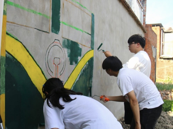 下午三点,实践团成员稍作休整后,便全身心投入到乡村美化行动中。队员们手持画笔,以墙面为画布,继续未完成的墙体彩绘工作。他们分工明确、配合默契,有的负责勾勒线条,有的专注调配色彩,有的精心填充图案。原本朴素单调的墙面,在队员们的巧手下,逐渐变成了一幅幅展现乡村活力与美好愿景的艺术作品,为韩庄村增添了一抹亮丽的色彩。