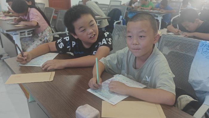 “写的时候不用怕写错,把心里最想说的话记下来就好。”队员们俯身为孩子们示范书信格式,遇到低年级孩子识字有限,便耐心听他们口述后代为记录。有个孩子握着笔许久,抬头问:“可以画一幅画贴在信里吗?我想让爸爸妈妈看看我画的新家。”队员们立刻找来胶水,笑着说:“当然可以,画画也是心里话呀。” 孩子们伏案书写的模样格外认真:有的蹙着眉思考未来想成为什么样子,有的边写边用橡皮擦改,生怕哪个字没写好;还有的写完后小心翼翼地折成纸飞机形状,说“这样信就能飞得更快”。当有孩子把信递给队员帮忙检查时,字里行间的纯真与真诚,让在场每个人都深受触动。