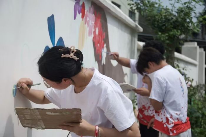 晨光中,画笔勾勒协作新篇!师生抵达现场,默契分组协作:一组专注于“花朵与蝴蝶”新创作,行前深研的设计方案化作笔下实践——琢磨花瓣的弧度,调和蝶翼的光影;另一组则环绕导师,对昨日作品精雕细琢。老师轻点画壁,与同学们并肩探讨:调整此处饱和,优化彼处笔触,共同唤醒墙面沉睡的艺术质感。