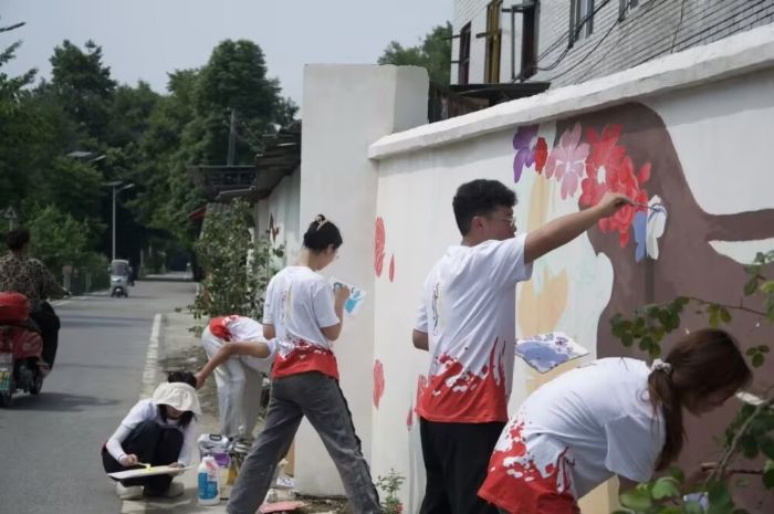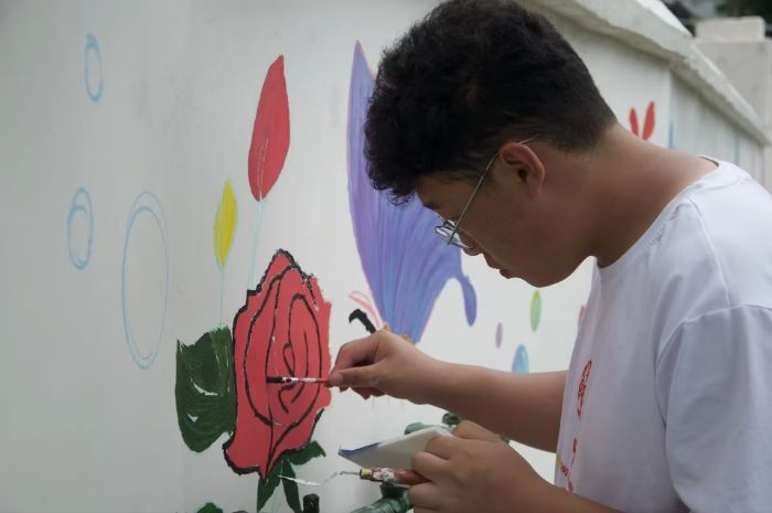 绘制过程中,墙面的不平整成为棘手难题,颜料易堆积、线条难流畅勾勒。他们耐心补涂、修饰,用一笔一划攻克难题,面对烈日炙烤,汗水浸透衣衫,他们便轮流作业、相互鼓劲。同学们以细腻笔触勾勒玫瑰轮廓,从花瓣舒展姿态到叶片脉络走向,反复雕琢。让花朵与蝴蝶在墙面上逐步“苏醒”,每道笔触都饱含对乡村美化的热忱。