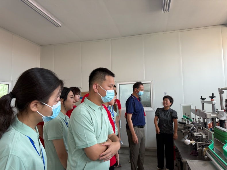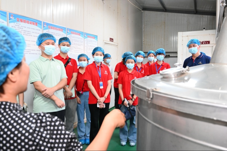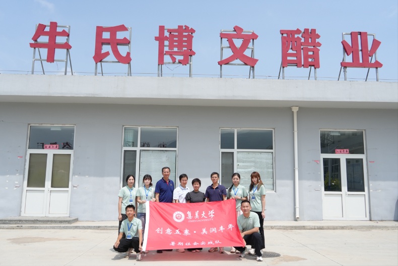 离开中医药文化馆,实践队一行来到了牛氏博文醋厂。刚踏入厂区,浓郁的醋香便萦绕鼻尖,这是四代人匠心传承的百年味道。在负责人程姣带领下,队员们深入了解了从蒸煮、糖化到发酵、熏淋的传统酿醋工艺,每一道工序都凝聚着匠人智慧。产品展示区内,古朴陶缸与现代包装相映成趣,文创礼盒既保留传统韵味又赋予新意。