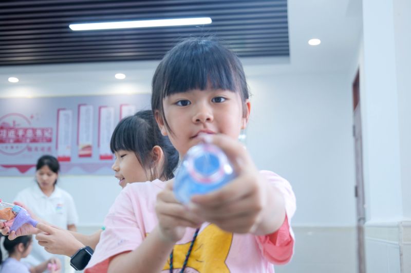 活动中,队员们以多元形式传递知识与温暖:美术课上,七彩水母在画纸上绽放灵动光彩,粘土玫瑰在指尖绽放立体芬芳,彩绘蛋糕在色彩中勾勒甜蜜想象;创意实验课里,塑料瓶与气球变身“空气炮”,一声声清脆响动点燃孩子们的探索欲。而“情绪特工队”课程更显用心,队员们借助动画片段,带领孩子们认识快乐、悲伤、愤怒等五种基础情绪,引导他们用语言表达内心感受。