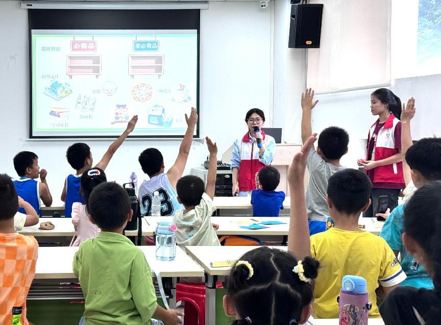 2025年7月15日,华南师范大学物理学院四进永和服务队队员黄晴在广州市黄埔区永和社工服务站社区活动中心开展了“小小财富探险家之零花钱大作战’财商启蒙课程”。课程通过情景模拟、互动游戏和小组讨论等形式,引导孩子们认识金钱来源、学会合理消费与储蓄,帮助基层儿童形成正确的价值观。