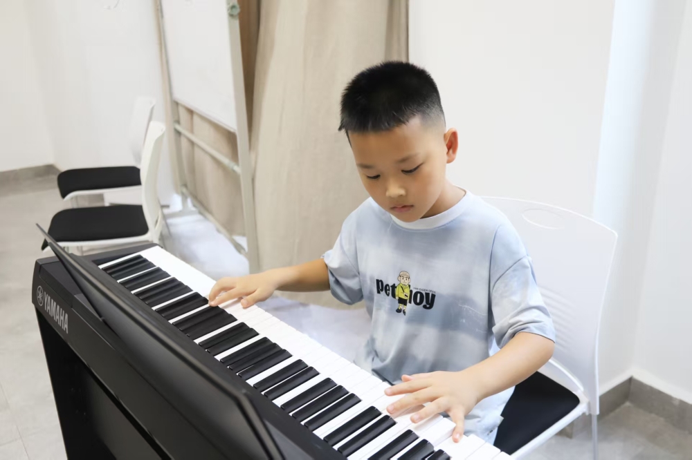 合唱环节将课堂推向高潮。志愿者率先示范演唱,歌声温柔而富有感染力。一个小朋友主动走向钢琴,流畅弹奏《我和我的祖国》旋律,其余孩子围坐合唱:“袅袅炊烟,小小村落,路上一道辙……”稚嫩的童声与悠扬的琴声交织,眼中闪耀着对祖国的纯粹热爱。一位扎羊角辫的小女孩课后分享:“这旋律让我想起升旗时的心跳,我想把对祖国的爱都唱出来。”歌声中,爱国情怀浸润童心,音乐成为传递情感的桥梁。