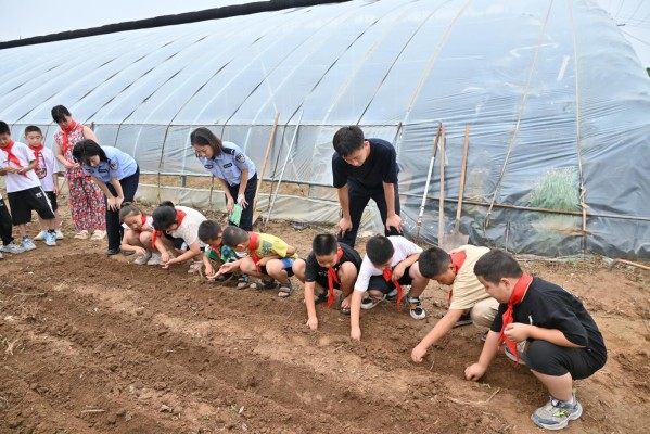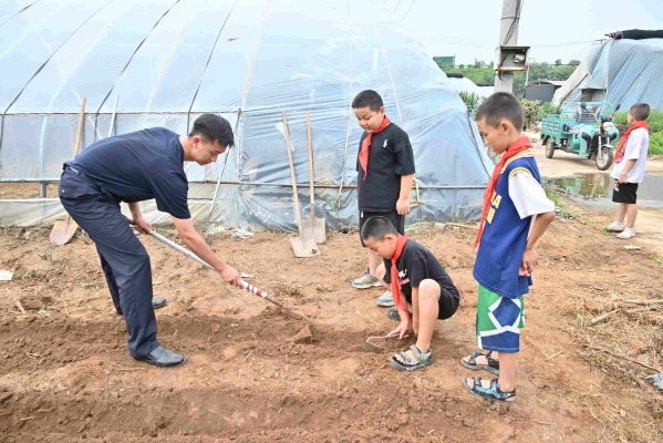 实践团成员不仅学习农业技术、参与农事劳作,更以实际行动传递责任精神,践行服务人民的初心使命。从翻土、播种到浇水,实践团成员头顶烈日,俯身田间,与村民一同劳作。田间劳动间隙,实践团成员手把手教会孩子们佩戴红领巾,使孩子们深刻体会到“粒粒皆辛苦”的不易,上了一堂别开生面的爱国教育实践课程。