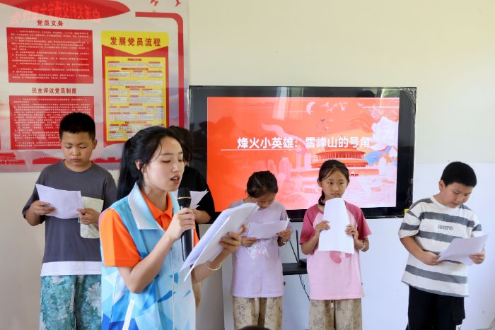 7月15日,“烽火少年梦”红色剧本演绎活动在湘西州古丈县断龙山镇白溪关村党群服务中心活动室顺利开展。本次活动由“望山”青禾服务队策划组织,其带领三十余名当地青少年通过沉浸式剧本演绎,重温红色文化历史,为当地孩子们播撒红色文化的种子。
