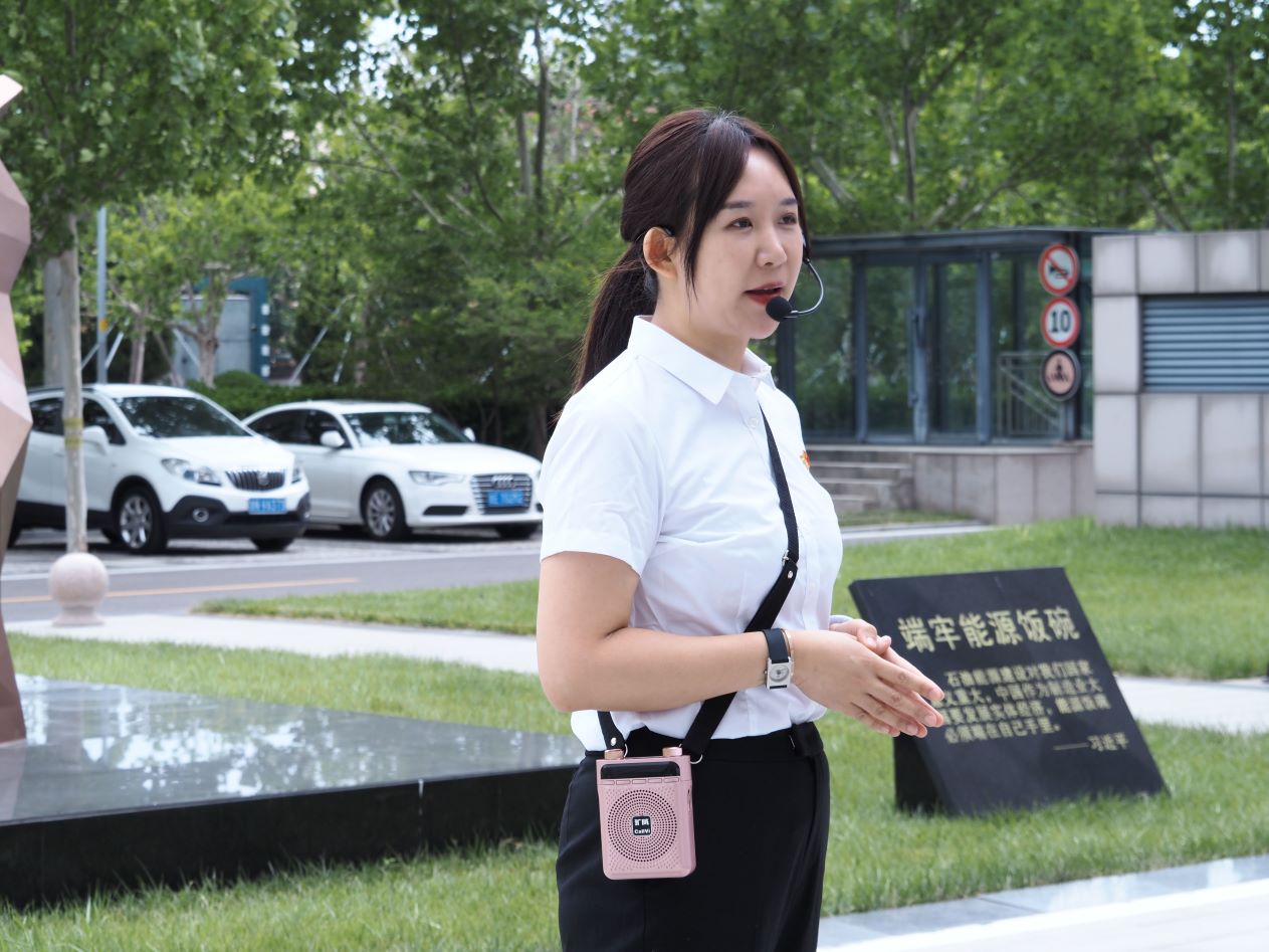 最后,讲解员带领大家移步于广场,为大家讲述了广场上两座雕像的寓意及相关背景。其中,“端牢能源饭碗”雕像手掌捧着石油芳烃,其分子式体现能源饭碗掌握在自己手中,雕像呈V字造型,既代表胜利英文首字母,也象征在端牢能源饭碗征程上取得的一项又一项胜利。西边的“利智先行”雕像,源自王献之书写的“一”字,经艺术加工呈现出逆龄前行的形象,代表科研人员不怕困难、克服困难的精神面貌。“端牢能源饭碗”雕像与“利智先行”书法石刻遥相呼应。此外,讲解员还提到,总书记曾在该广场与两百多名科研人员亲切交流并发表重要讲话,强调石油战线始终是共和国改革发展的一面旗帜,要继续举好这面旗帜,在确保国家能源安全和端牢能源饭碗上再进攻、再创佳绩。