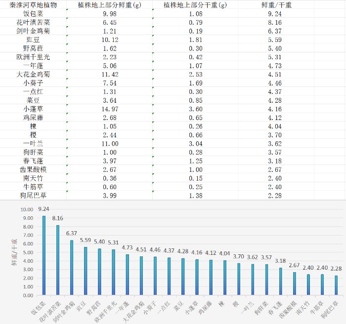 此外,我们还观察到其他植物如一年蓬和小蓬草等的鲜重与干重比例也较高,这可能暗示着它们同样具有较高的含水量和对湿润环境的偏好。另一方面,狗尾巴草和小葵子等植物的鲜重与干重比例较低,显示出它们可能更加适应干燥或资源有限的环境。