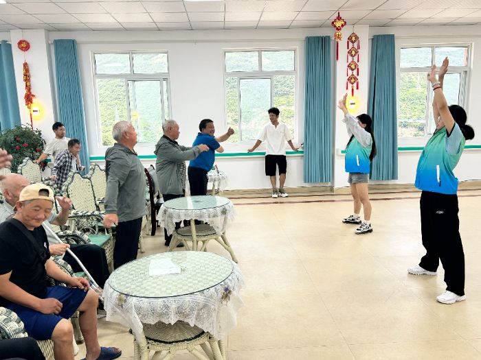 为增强团队推普影响力,中文专业同学开展了一场普通话与气象防灾减灾知识讲座。讲座中,村民们积极参与绕口令挑战,现场气氛活跃。同时,社工组同学前往甘孜州泸定老年养护院开展慰问活动,用亲切的方言与老人们交流,拉近了彼此的距离,传递了温暖与关怀。