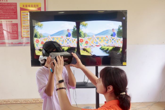 为了点燃孩子们心中更大的工程梦想,服务队巧妙地运用科技让冠军组纸桥“走出”课堂。首先利用AI图像生成工具,输入冠军组纸桥的关键结构特征和乡村常见场景关键词。冠军组纸桥瞬间“化身”为溪流上的竹木小桥、连接田埂的坚实便桥。接着,服务队将生成的图片导入VR眼镜里,当孩子们戴上VR眼镜,他们看到小朋友脚下踩着的正是以他们冠军纸桥为原型“建造”的乡村小桥,他们可以“走”上桥面,低头观察桥下熟悉的加固结构如何支撑行人。这一刻,抽象的工程原理变成了可触摸的家乡未来图景。