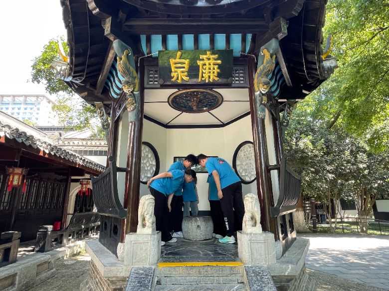 实践团成员怀揣崇敬与求知之心,深入探访包公故居的历史印记。从寓意“清泉鉴心”的廉泉井,到镌刻着“后世子孙仕宦,有犯赃滥者,不得放归本家”铁律的《包拯家训》碑;从庄严肃穆的孝肃阁,到象征包拯刚正不阿品格的戒贪壁雕,学子们驻足凝视,细心研读。在包拯塑像前,成员们诵读其“清心为治本,直道是身谋”的诗句,沉浸式体悟其“铁面无私、清廉如水”的为官之道。故居内的一砖一瓦、一匾一联,无声诉说着这位北宋名臣“拒礼为开廉洁风”的浩然正气。成员们特别聚焦学习了包拯“不持一砚归”的廉洁典故,对其身体力行的严于律己有了更深刻的认识。
