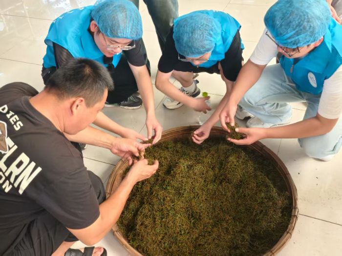 经历三十分钟的“摇青”后,茶叶被送入机器,接受长达九十分钟的“揉捻”步骤。随着时光流转,叶片的边缘悄然由绿变红。紧接着,便是红茶制作工艺的关键——长达四至六小时的发酵过程。尹经理介绍,夏天高温时节,这蜕变发酵可在常温下自然进行,而在春秋季节则应另外加热。当日下午,实践团见到了发酵完成的茶叶,它们褪去青涩,变得红透发亮。而茶叶制成的最后一步就是炒制。瑞草园在此刻亦展现了它的核心技术——尹经理亲手设计了一款别致的炒制机器。它不仅精准掌控火候与翻炒,更能在巧妙的在揉搓间与机器的翻动之间,使茶叶蜷曲成小球,而这种“小球”在泡制时则能够舒展开漂亮的形状。这不仅是瑞草园红茶的视觉标识,更凝聚着尹经理对工艺美学的执着追求。