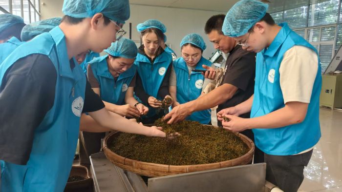 继7月18日体验绿茶采摘与炒制后,实践团7月19日开始着手红茶的制作。来到制茶车间,这里有着严格的卫生条件与消杀要求,同时相较于绿茶的清雅直接,红茶的工艺更为复杂多样,在炒制的基础之上,添入了“发酵”这一精妙的制作工艺。