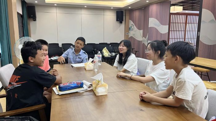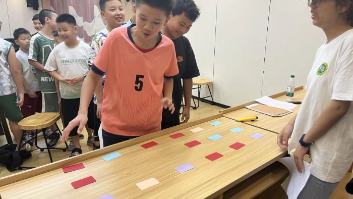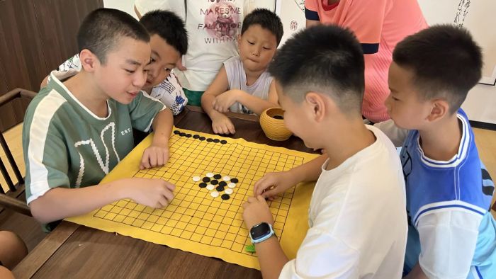 作业时间结束后,团队成员与部分小朋友围坐成圈,以诗为媒,展开了一场妙趣横生的文字较量——飞花令,考验孩子们古诗词储量的同时,也在互动中传播了中华传统文化的魅力,看到孩子们努力回想诗词的模样,成员们的成就感十足。从“意欲捕鸣蝉”到“映日荷花别样红”,诗词接龙如溪水潺潺,孩子们的犹豫声与成员们的小声提醒交织成趣。屋外蝉鸣声声不息,屋内孩童意犹未尽,这场诗词互动让教室里充满书香与童趣,也让孩子们畅游诗词的海洋,收获知识与欢笑。除此之外,一部分孩子们则是聚在棋桌前,继续前一日的五子棋对弈,成员们在旁指导阵法,提供谋略,现场笑声不断。