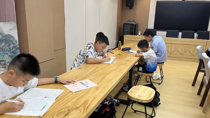 上午8:40,孩子们陆陆续续来到教室,晨间鸟语,窗畔蝉鸣,伴随着孩子们的欢笑声,将活动室衬托得格外有生机,仿佛闭上眼就能在脑海中浮现夏日清新绿意。每日作业时间都从9:00正式开始,阳光穿透磨砂玻璃,倾洒在孩子们的书桌上,小老师们正俯身在孩子们身边耐心监督着,不时为小朋友解答难题,看着孩子们细致认真的完成作业,十分感慨。有的孩子手捧课外书,眉头微蹙,一副沉浸于书中世界的样子;有的则在练习本上一笔一划书写生字,力求工整。“以前在家写作业总爱分心,在这里和小伙伴一起学,还有老师随时帮忙,感觉效率高多啦!”刚完成英语练字的小朋友举着本子向老师展示,脸上展开笑颜。这段专注的学习时光,不仅让孩子们在轻松氛围中逐步推进暑期作业任务,更在老师的陪伴下,一点点播种下自主学习的种子。