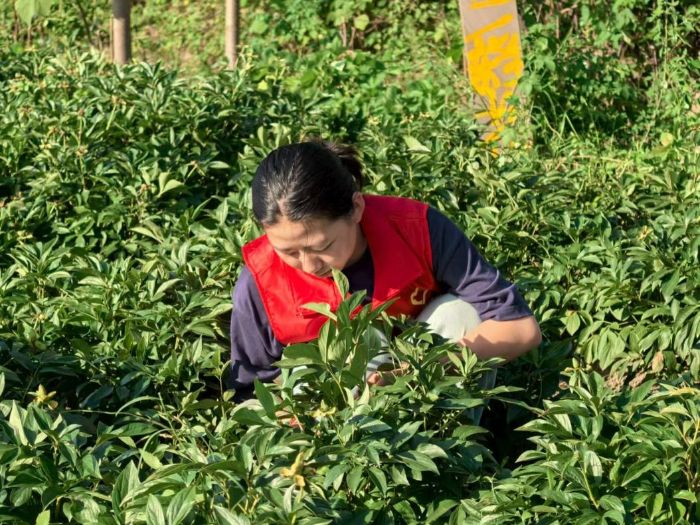 图为队员在中药材种植基地近距离观察牡丹植株(刘睿博摄)